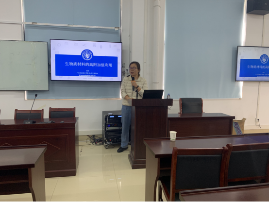 王蕾博士以《生物质材料的高附加值利用》为题作学术报告。主要讲述了以蛋白质材料为代表的生物质材料在基础科学研究中的应用,如蛋白质基发光材料、蛋白质基导电材料。并规划了未来以可持续来源的生物质为原材料在生物塑料、污水处理等领域进行高附加值应用的研究计划。