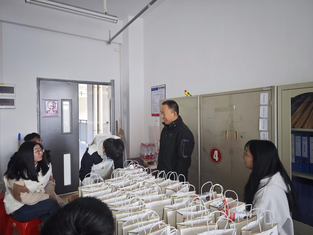 2023年12月21日早上10点,化工学院在化工学院楼C216为24届化工考研学子送上考研精美礼品袋。化工学院党委书记隋亦可、党委副书记纪玉刚、辅导员李洋与考研学子亲切交谈,了解考研学子的复习情况和身心状态,用23届师兄师姐考研的优秀事迹鼓励同学们要对自己充满信心,在临考前放松心态,以平常心奔赴考场,早日考上自己理想的院校,为化工学院争光添彩。