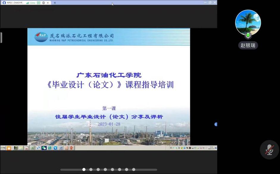 2024年3月17日上午9点,广油-瑞派创新设计产业学院“产教融合”之工程设计第二期讲座如约而至,化学工程学院孟秀红副院长邀请茂名瑞派石化工程有限公司赵银瑞高级工程师为师生开展线上培训,近150名师生观看学习。