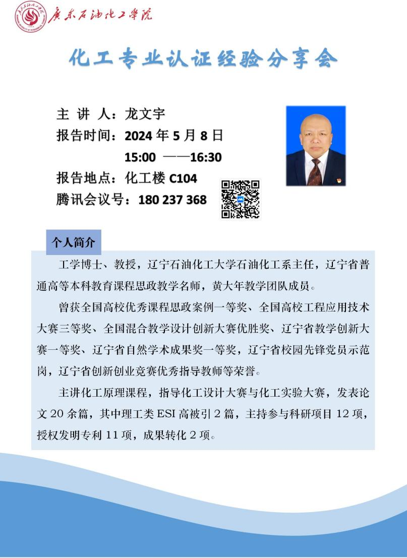 为高效有序推进化工专业认证工作,5月8日下午,化学工程学院邀请辽宁石油化工大学龙文宇教授开展化工专业认证经验分享会,会议在化工楼C104进行,学院全体教师参加,会议由孟秀红副院长主持。