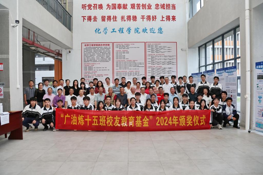 11月10日下午,在best365足球官网70周年校庆之际,化学工程学院在化工楼C203室隆重举行“广油炼十五校友教育基金”2024年颁奖仪式。学校党委常委、副校长周如金教授、学校党政办公室副主任、校友总会秘书长杨东娥、化学工程学院领导班子成员、广油“炼十五班”20余名校友及获奖师生代表出席了颁奖仪式。