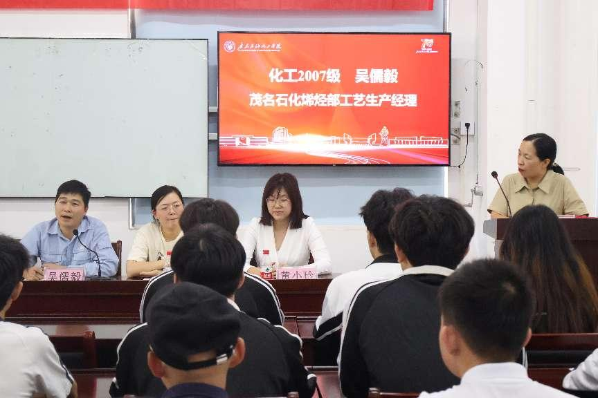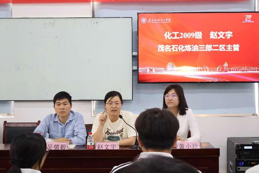 随后,赵文宇校友分享了她的成长故事。作为茂名石化炼油三部二区主管,她讲述了自己在石化行业的奋斗经历,分享了面对挑战时的坚持与勇气,以及在职业生涯中取得的显著成绩。她的分享让在场学生深受启发,更加坚定了投身化工行业的决心。