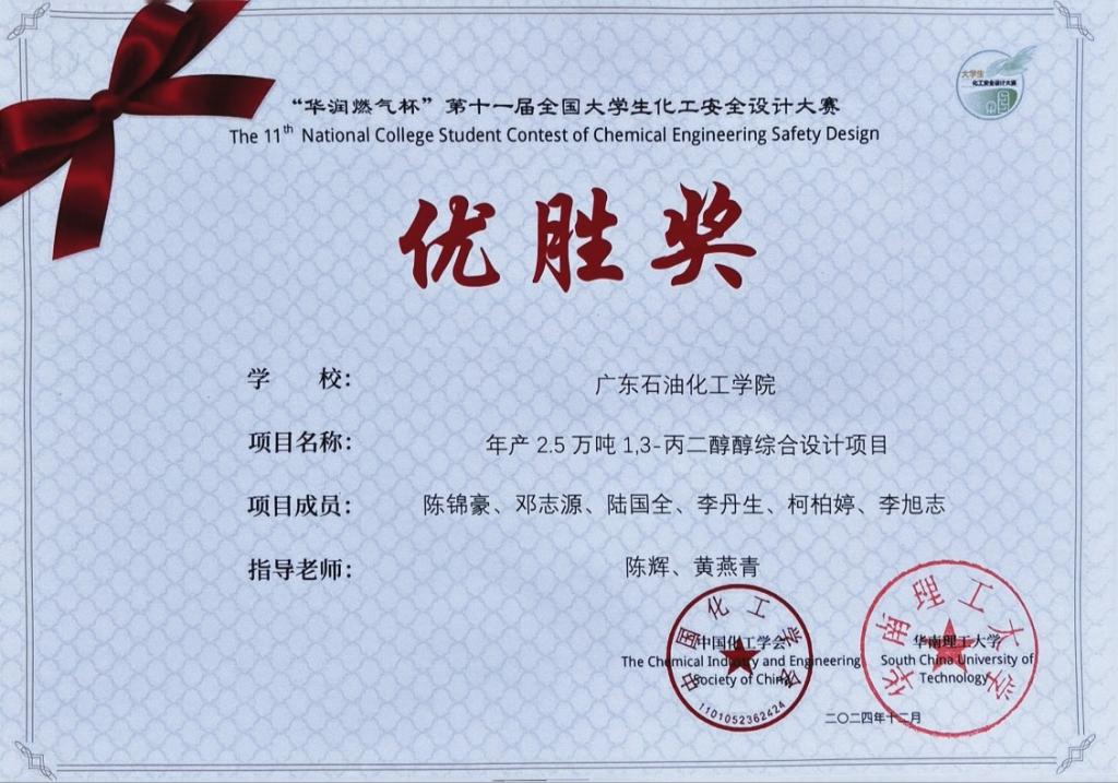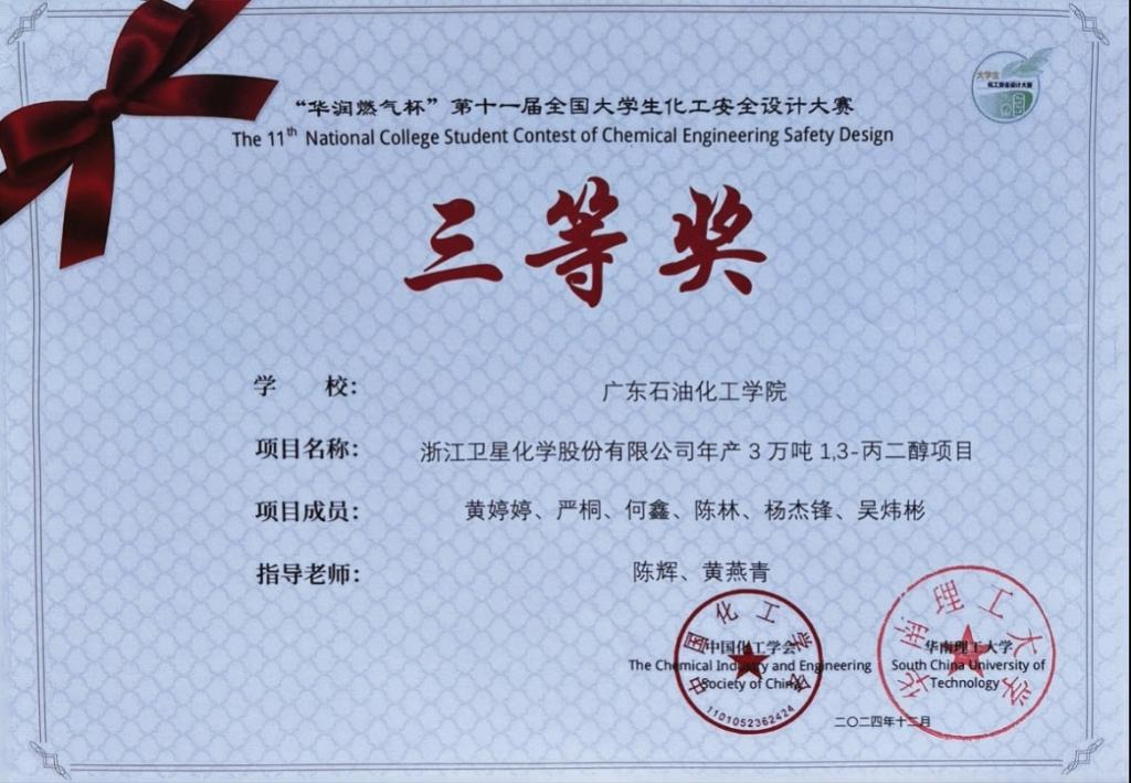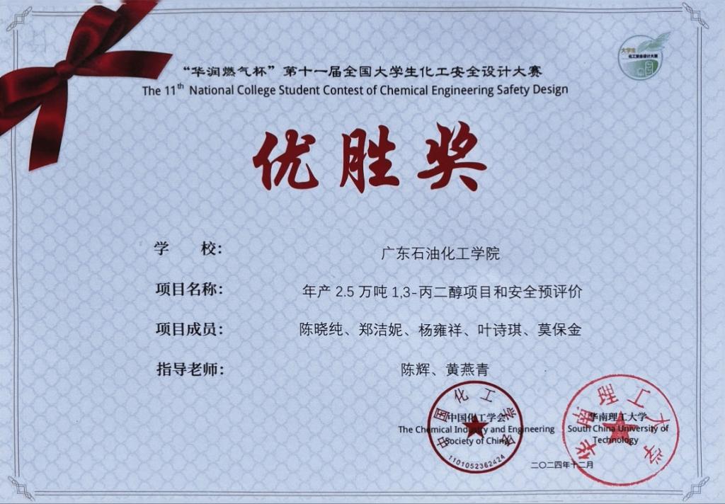 近日,“华润燃气杯”第十一届全国大学生化工安全设计大赛落下帷幕,经过近7个月的艰苦努力和奋力拼搏,由陈辉和黄燕青老师指导的三支队全部获奖, 其中安全合醇队团队(成员:黄婷婷、严桐、何鑫、陈林、杨杰锋、吴炜彬)获三等奖,Dream Chaser团队(陈锦豪、邓志源、陆国全、李丹生、柯柏婷、李旭志)与醇一不杂团队(陈晓纯、郑洁妮、杨雍祥、叶诗琪、莫保金)获优胜奖。