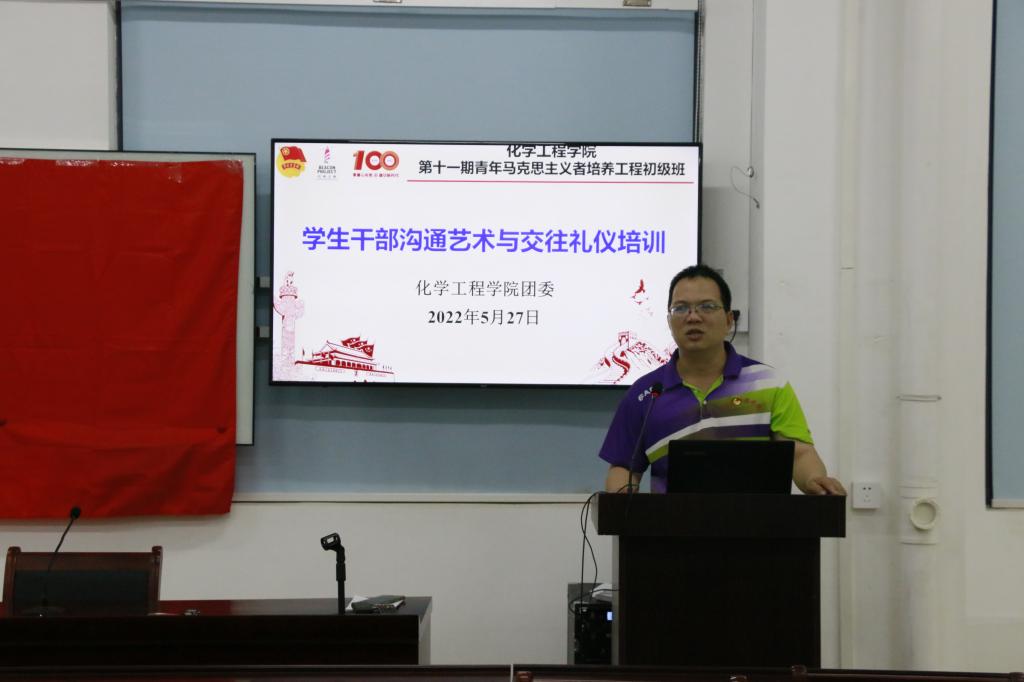 2022年5月27日晚,在西城校区化工楼C104,化学工程学院举行第十一期青年马克思主义者培养工程初级班之《学生生干部沟通艺术与交往礼仪》培训。化工学院团委书记陈海均以及全院学生干部80多人参加了培训。本次培训特邀马克思主义学院基础教研室范加珍老师作为主讲嘉宾。