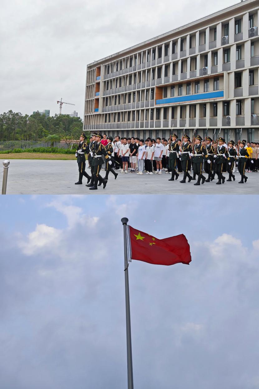 在庄严肃穆的国歌声中,鲜红的五星红旗冉冉升起,场上全体成员都以笔挺的身姿向国旗行注目礼,共同见证国旗缓缓升至旗杆顶端的庄严神圣时刻。