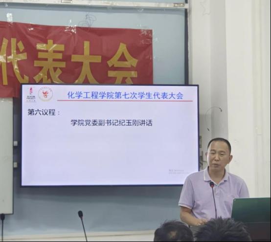 党委副书记纪玉刚祝贺化学工程学院第七次学生代表大会成功召开,对上一届学生会干部所发挥的积极作用和作出的贡献表示衷心感谢,并对新一届学生会的工作和发展提出三点要求:一是希望每一位青年学子都能坚定理想信念,筑牢思想根基,将个人发展与第二个一百年目标紧密相连,与实现中国式现代化和中华民族伟大复兴的宏伟事业深度融合。二是勇于开拓创新,提升服务效能。在工作中要善于思考、勤于总结、勇于创新,敢想敢为、善作善成。三是平衡学习工作,发挥模范作用。要妥善处理好学习与工作的关系,在各个方面以身作则,树立良好的模范形象。