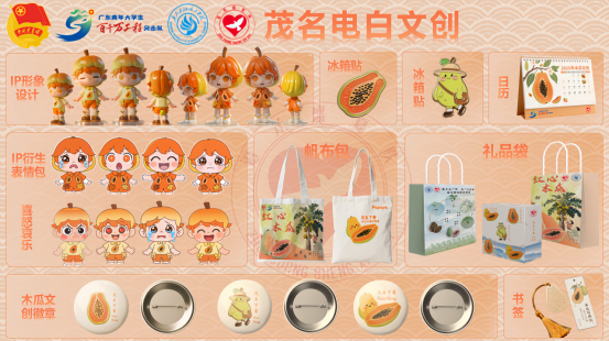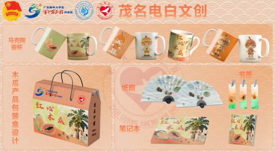 助农不止于销售!团队发挥设计专长,以“下寮木瓜”为创作灵感,开发出一系列独具特色的文创产品。利用手绘草图到电脑制图,队员们巧妙融合木瓜形态、乡村肌理与美好寓意,制作出明信片、帆布袋、钥匙扣等实用又充满乡土情怀的物件。这些文创品在直播间作为“助农福袋”或特色周边同步推广,不仅增加了产品附加值,更让“电白木瓜”的品牌形象以艺术形式深入人心。