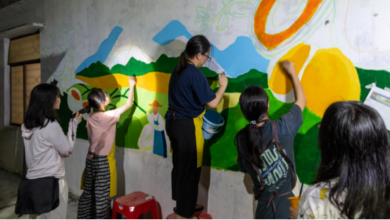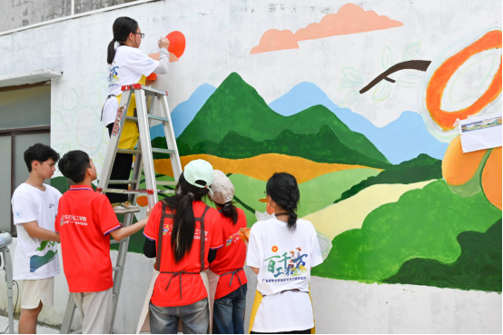 用艺术点亮乡村!团队成员将助农的热情从直播间延伸到村头巷尾。队员们发挥美术才能,以“木瓜丰收”和“乡村振兴”为主题,在电白区林头镇下寮村村委会内墙创作了大型彩绘墙。从设计构图到调色上墙,一笔一画倾注心血。原本单调的白墙变身充满生机的艺术画廊,不仅美化了人居环境,更让木瓜产业成为下寮亮丽名片,激发村民自豪感,吸引路人打卡关注。