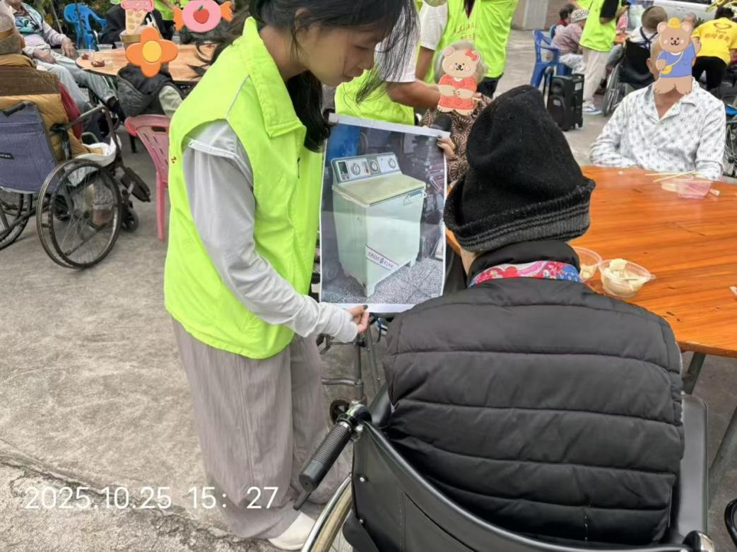 活动现场暖意融融。志愿者们始终秉持着耐心与贴心,小心翼翼地搀扶行动不便的老人下楼就座,围在老人身边轻声交谈,静静倾听他们讲述过往岁月里的故事,时不时送上一句节日的诚挚问候。在“重阳追忆” 有奖竞猜环节,当熟悉的红歌旋律响起、经典的时代话题抛出,老人们瞬间打开了 “话匣子”,纷纷举手抢答,在回忆中重温流金岁月,现场掌声与欢笑声此起彼伏,温情在互动间不断升温。与此同时,另一组志愿者则主动走进老人房间,探望不便下楼的长辈,坐在床边陪他们拉家常、问冷暖,用轻声细语的陪伴,让温暖覆盖到敬老院的每一个角落,不让任何一位老人错过节日的热闹。