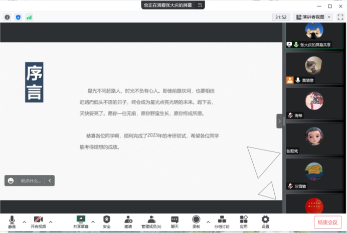 最后,黄清意勉励同学们要合理利用寒假时间,进行充分的复习,为复试打下坚实的基础,同时做好自己的就业规划,不浪费美好年华。考研毕业生表示,感谢学长学姐们为我们分享复试经验,通过本次考研经验交流会自己有了更明确的方向,对复试流程也更为清晰,会好好利用这个寒假的时间来做好复试准备,不负韶华,只争朝夕。