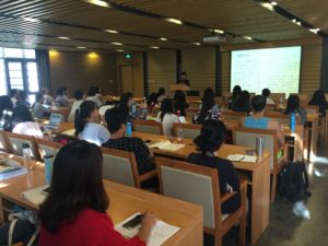 下午3:30-5:00,张静博士做了题为“古典诗词与现代人生”的报告。张静博士首先介绍了作为中华民族传统文化精华的诗词对当代社会以及对人们的修为、情感、人格方面的影响,并与在场师生分享了自己参与央视《中国诗词大会—第二季》节目的经历。张静博士认为,只要有一颗不死的诗心,诗词文化就不会枯竭。接着,张静博士为在场师生分析了杜甫的《缚鸡行》、《又呈吴郎》,并结合自己的切身体会,启发大家要在生活中树立更开阔的视野与更豁达的人生态度,随后又带领大家欣赏了黄庭坚的《王充道送水仙花五十支》,讲解了余光中的《乡愁》等多首经典诗词作品。张静博士指出,对自己抱有一种怎样的态度、有一种怎样的期许,就会有一种怎样的人生,同时更要注重人格修养与品格发展。最后,张静博士通过诗词向在座的师生表达了热切的期望,希望大家都能像雪花一样舞出自己的精彩人生,并以赠言“莫负相逢人海间”为讲座画上了完美的句号。通过张静博士的讲座,在场师生深刻感受到中国古典诗词的力量以及将中国古典诗词文化发扬光大的重大责任。