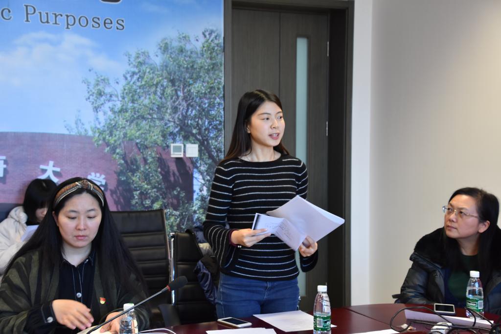 吴越的入党介绍人李莉文和仵胜奇首先向大家介绍了吴越的政治思想、专业学习以及社会服务等情况。接着,吴越宣读了入党志愿书。吴越是开云官网2018级MTI班长,曾在2018年9月至2019年7月担任开云官网2018级少数民族预科班辅导员。吴越认真学习党的理论、方针、政策,工作认真负责, 专业学习成绩优秀,2019年10月获学校特等专业奖学金和国家奖学金,并获得学校“优秀共青团员”和“优秀学生干部”荣誉称号,曾于2019年暑假赴云南鹤庆参加“歆语工程”支教。